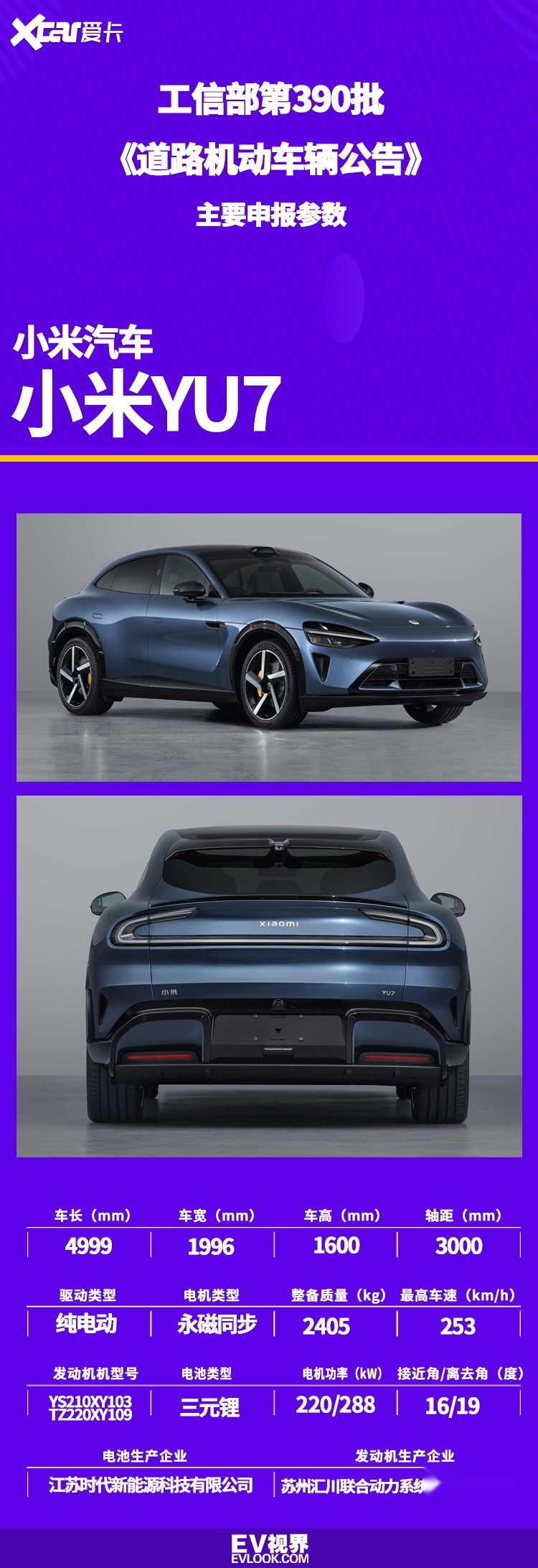 在车身尺寸方面,小米YU7的长宽高分别为4999mm、1996mm和1600mm,轴距为3000mm。在动力配置上,小米YU7配备了双电机驱动系统,前后电机上限功率分别为220kW和288kW,最高车速可达253km/h。